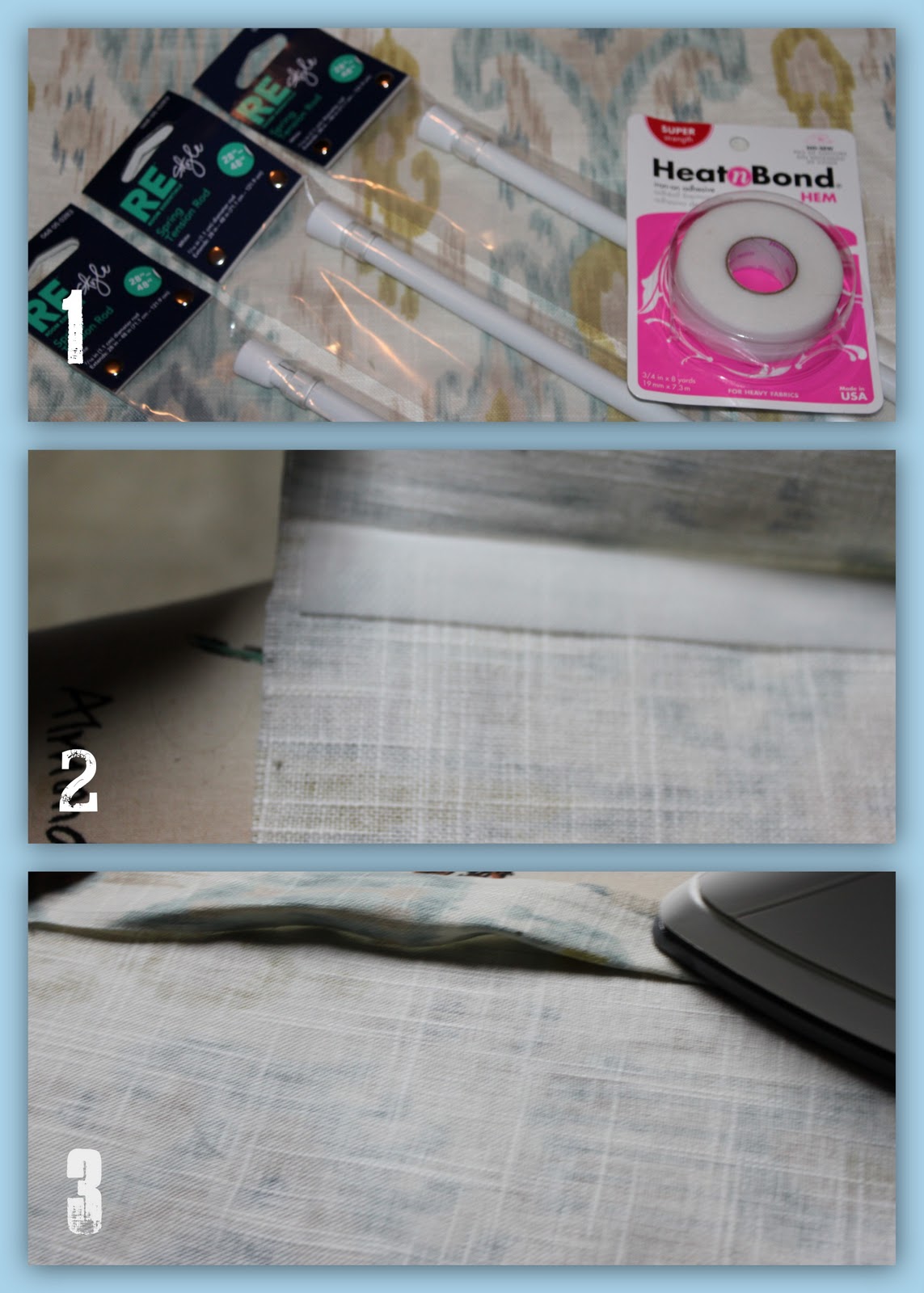 1. Cut your fabric to fit your window, giving yourself about an inch extra on each side. I purchased the tension rods from Target, Heat and Bond from Joanns.